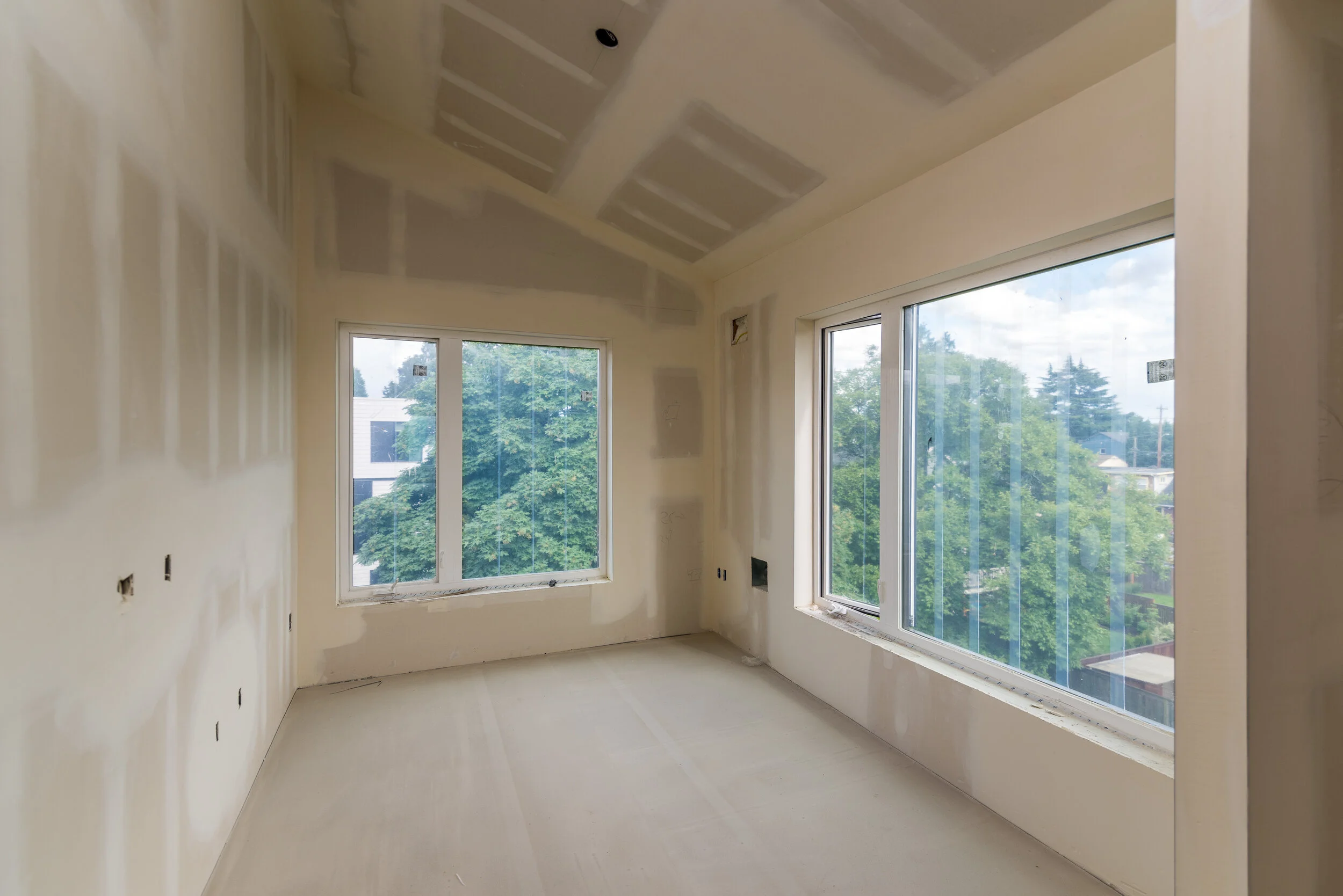Progress photo of Lyra fourth floor corner unit, featuring vaulted ceilings, large windows and abundant natural light