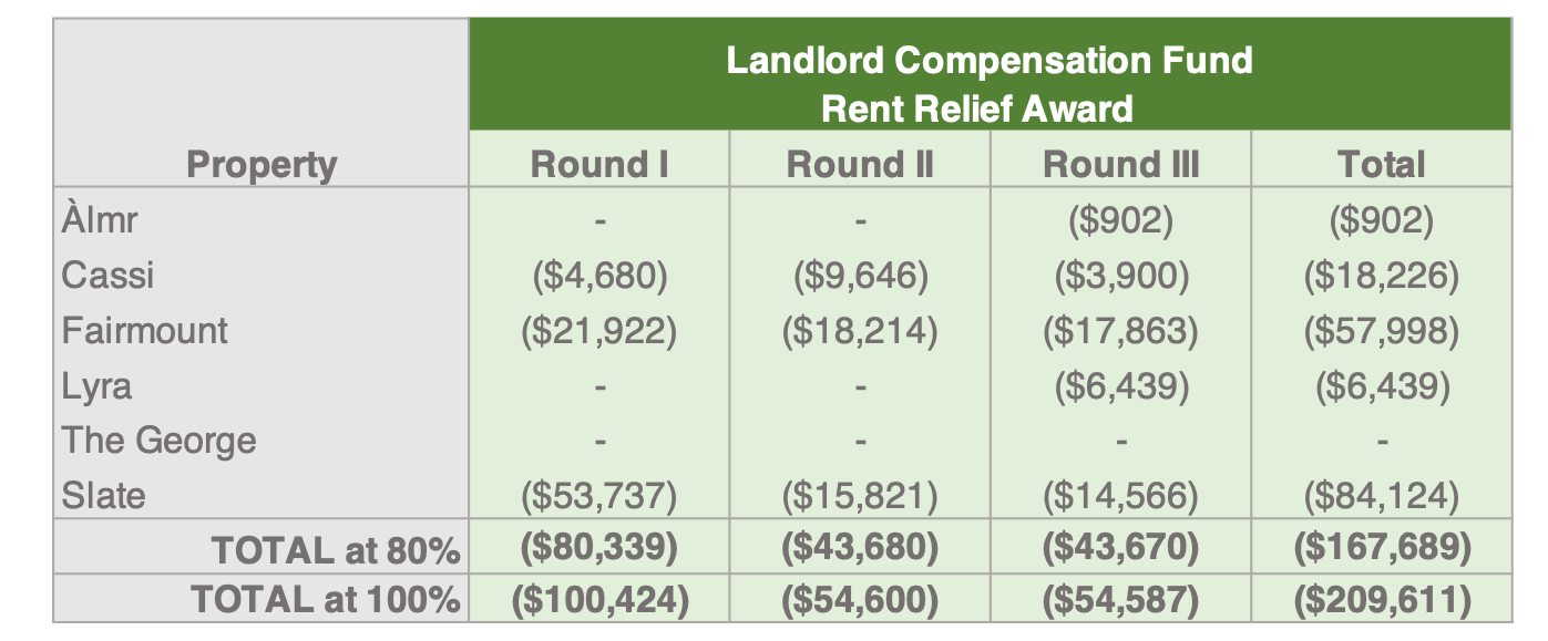 The table below provides a final summary of residential rent relief awarded to UD+P properties through Oregon’s Landlord Compensation Fund. To date, we have received all Round I and II payments, and Round III payments for Slate, Fairmount and Cassi. Under the original program funding guidelines, landlords were required to forgive 20% of past due balances. This week, the Oregon Legislature authorized the Landlord Compensation Fund to pay the remaining 20 percent of unpaid rent, instead of having it forgiven by the landlord. Accordingly, we anticipate to receive additional rent relief payments totaling $49,624—the outstanding Round III payments at 80% for Àlmr and Lyra ($7,341) and the additional 20% payment for all three Rounds ($41,922). Total rent relief awards received from the Landlord Compensation Fund are expected to exceed $209,000.