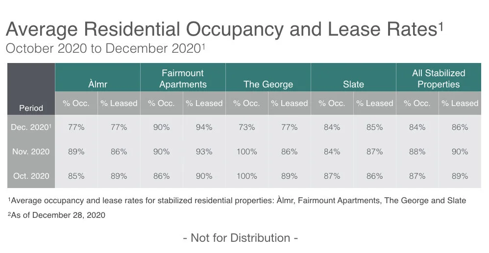 The table at the right shows average monthly residential occupancy and lease rates for individual properties and portfolio-wide. In December, portfolio-wide average occupancy and lease rates for stabilized residential properties dropped to 84% and 86% respectively. This decline is largely attributed to an uptick in the number of notices received in late November and December at The George and Àlmr, as well as subsequent move-outs and a handful of lease breaks. Most move-outs are COVID-19 related. During the pandemic, residents are unable to enjoy the amenities and attractions that drew them to close-in, destination neighborhoods, such as Northwest Portland, due to restrictions on social, recreational and business activity. An increasing number of residents working remotely during the pandemic are relocating to suburbs, such as Tigard and Wilsonville, where they can get a larger apartment for a comparable rent. Others are relocating out of state or moving back in with parents. Few residents are relocating within the neighborhood, and most are moving outside of the City of Portland.