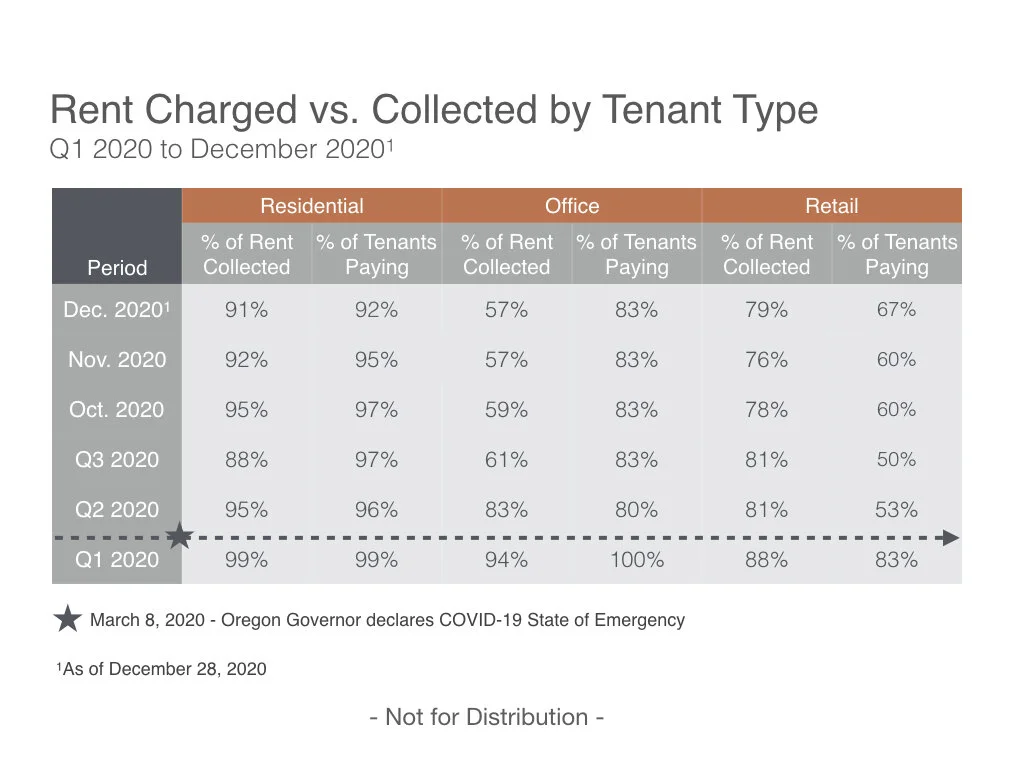 Retail and office rent collections have held steady since the start of the fourth quarter, with a slight decline in November coinciding with a 14-day statewide “freeze” implemented by Oregon Governor Kate Brown to reduce the spread of COVID-19. During the freeze, which began on November 18, restaurants were restricted to take-out only and retail was limited to 75% capacity. On December 3rd, Governor Brown introduced a COVID-19 Risk and Protection Framework, which limits social and at-home gatherings, restaurants, fitness establishments, retail stores and other entities, based on whether a county is designated low, moderate, high or extreme risk in the COVID-19 pandemic, based on recent infection rates. County risk levels will be assessed and updated every two weeks. All Portland metro area counties and the majority of Oregon counties currently fall within the “extreme risk” category, which limits restaurants to take-out and outdoor dining and restricts retail businesses to 50% maximum capacity. While these limitations pose a hardship for businesses in the retail, service and hospitality sectors, all of our retail tenants remain open for business. Our operations team continues to work closely with and support tenants navigating these unprecedented challenges.