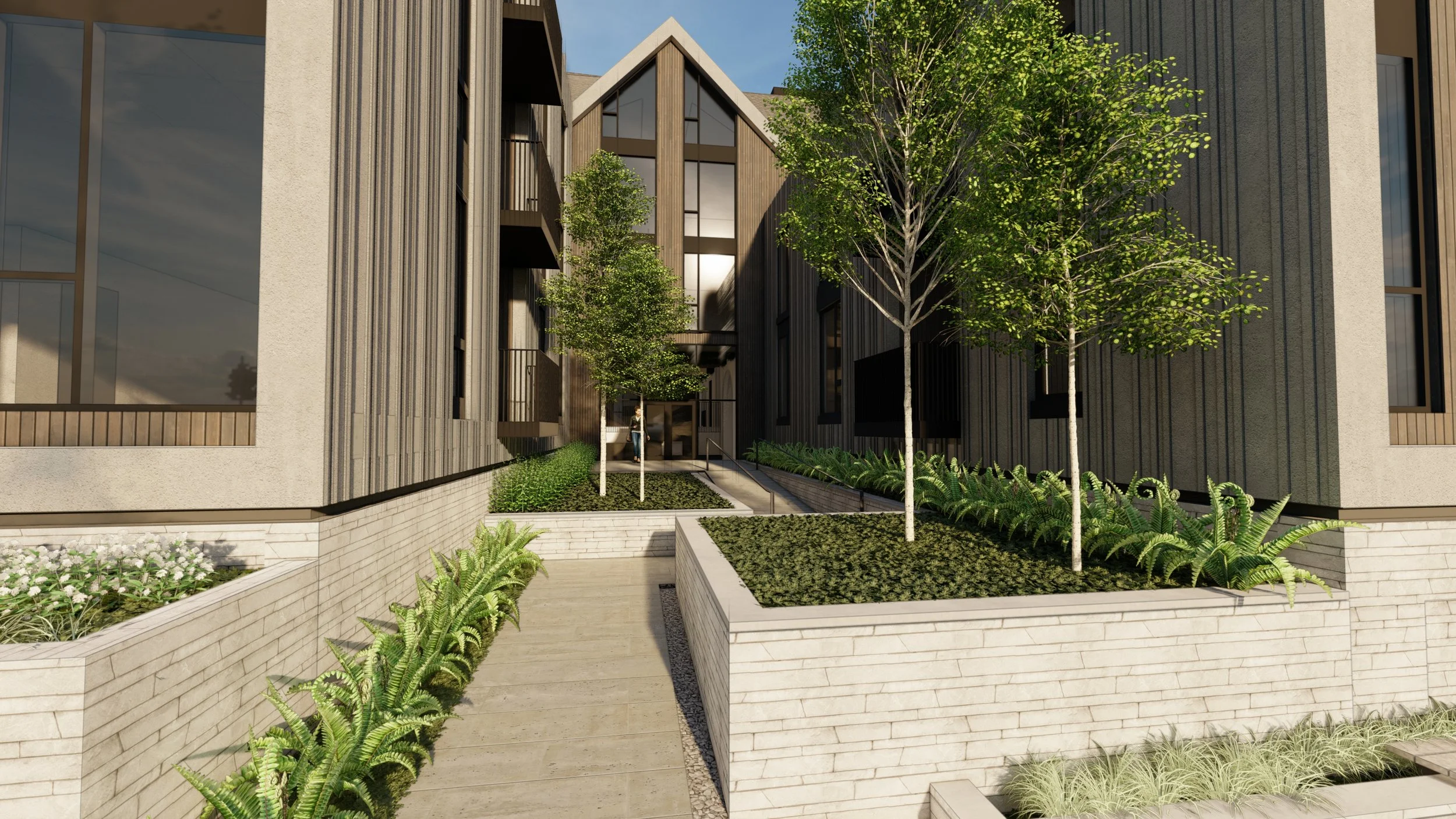 Recent rendering of our Lake Oswego North Anchor residential project’s exterior entry and courtyard.