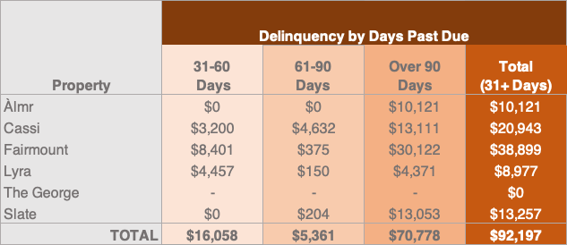 The table below summarizes residential delinquency (i.e., past due rent) attributed to both current and past residents as of December 28, 2021. Across our residential portfolio, delinquencies of 31 days or longer totaled $92,197 in December. Approximately half of the delinquency is owed by past renters. The other half is owed by current renters. At Fairmount, the property with the largest amount of back rent owed, nearly two thirds of the delinquency is attributed to four renters who have consistently struggled to pay rent since early in the pandemic. Together, these renters—three of whom have applied for rent assistance and one of whom is on a payment plan—owe a combined $25,000 in charges that are 31+ days past due. As described in more detail below, most current renters with significant arrearages have applied for rent assistance to cover their outstanding balances.