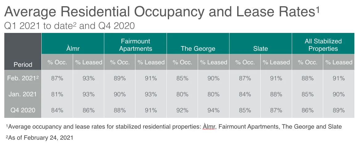 As leasing activity picks up and average lease rates rise across our stabilized portfolio, we have increased asking rents on most units and adjusted concessions. We are currently offering two weeks free rent on 1-bedroom units at Fairmount and four weeks free rent on 2-bedroom units at Slate. At Àlmr, we are offering six weeks free rent on two vacant units that have taken longer to lease. The George is fully leased. Across our portfolio, we continue to offer a “zero deposit” at move-in policy for all new leases.