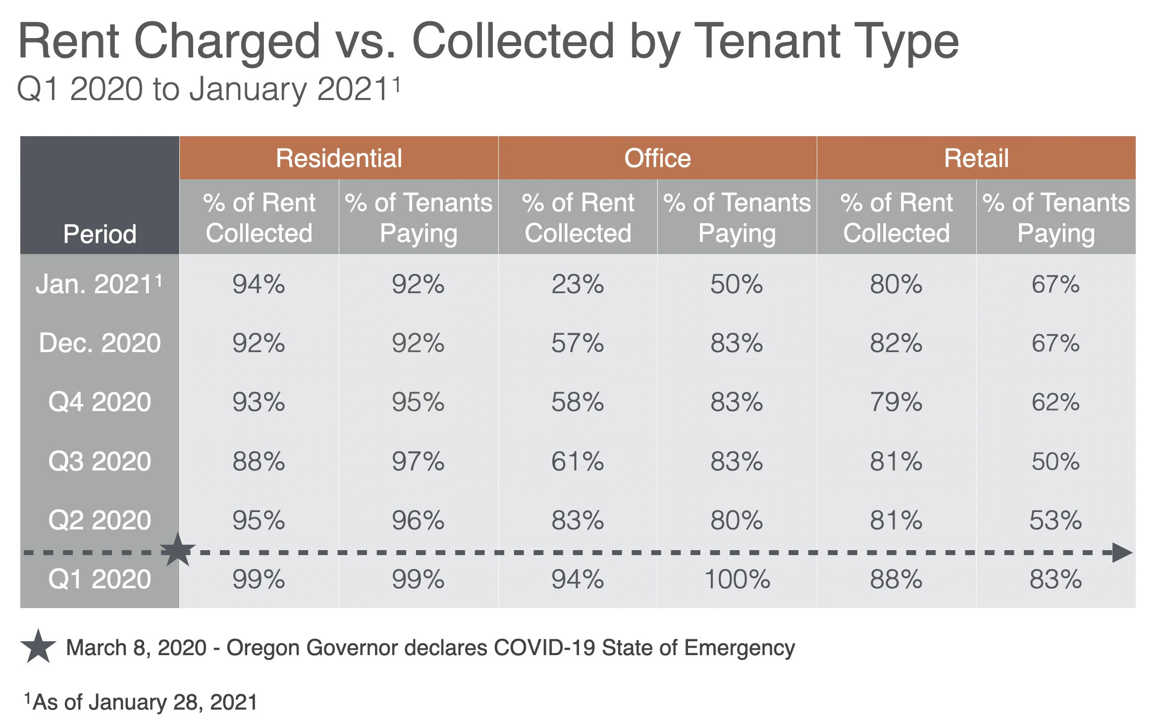 The table on the right summarizes rent charged versus rent collected by tenant type from Q1 2020 through January 2021 (as of 1/28/21). Quarterly rent collection data is provided for prior quarters, and monthly rent collection data is provided for the current quarter (Q1 2021). For the purpose of comparing month-over-month changes, December 2020 collection data is also provided.