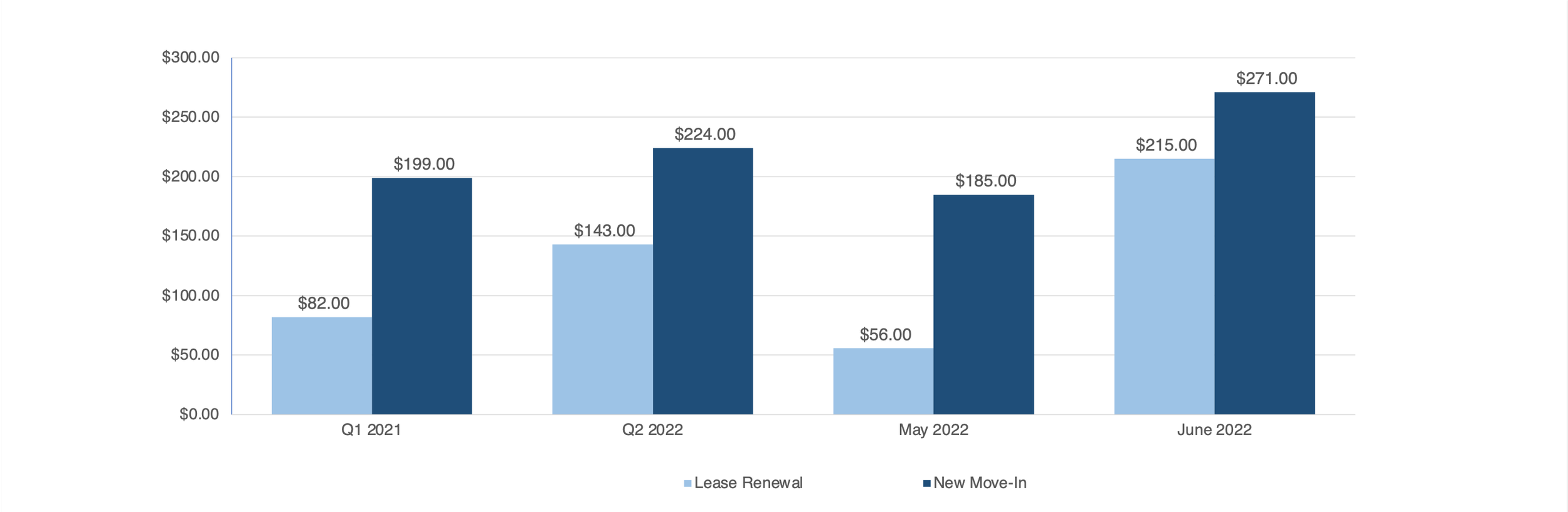 We executed 13 lease renewals in June. June renewals yielded average rent growth of 16.24% ($215)—significantly higher than average renewal rent growth of 2.89% ($56) in May. In Q2 2022, average renewal rent growth was 10.84% ($143), compared to 5.94% ($82) in Q1. We typically aim for 4 to 6% gross rent increases on renewals. In June and throughout Q2, a number of leases signed in the spring and summer of 2021 with deeper rent concessions (e.g. 8 weeks free rent) came up for renewal. These concessions lowered the effective rents of the units. Therefore, although we capped “actual rent” increases at 6%, the gross rent increase realized on units with previously discounted rents exceeded 6%. By August 2021, our Operations team had eliminated or significantly scaled back rent concessions as the market began to recover. Accordingly, moving forward, rent growth attributed to renewals is anticipated to return to the more typical 4 to 6% range.