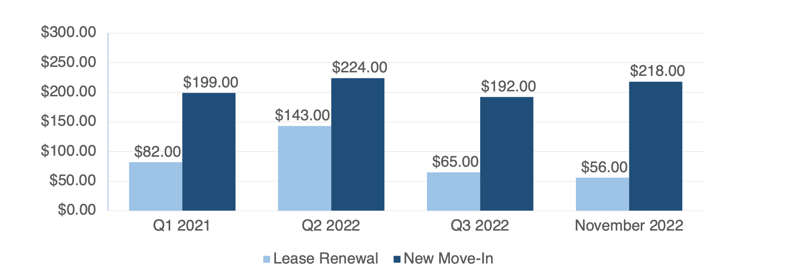 Historically, residential leasing activity slows down in the fourth quarter as the weather cools down and people’s focus turns to the holidays. In November, we received five rental applications and executed five new leases. As shown in the tables below, lease turnover (LTO) yielded average rent growth of 19.09% ($218) in November, up from 15.02% ($192) in Q3 2022. After a year of accelerated rent growth, rents are beginning to stabilize and rent increases are starting to taper off. Our Operations Team has budgeted for more modest, 3% rent increases in 2023 at all of our properties.